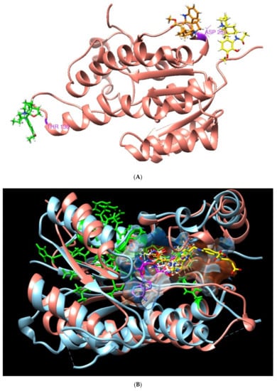 These results allow us to identify the importance of the position of the three plant metabolites in the Leishmania PTR1 that partially overlap with the NADP site (Rossman motif). In addition, it points to how the residues involved in human DHR with plant-based compounds (green zone, section B) do not interfere in the binding pocket of interest (Figure 4).