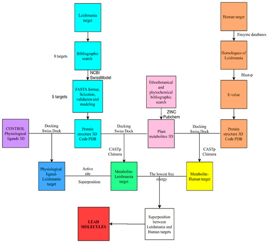 In our case we have applied a general protocol for the use of bioinformatics tools aimed at discriminating potential ligands for target proteins, although the structure of these are still unknown, which is summarized in Figure 5. Thus, in regard to the possible therapeutic targets of Leishmania, we obtained eight possible candidates through an exhaustive bibliographic search. As for the target proteins, after searching for its sequences, we verified if its structures were unknown. When the structure of the target protein was unknown, homology modelling was carried out with proteins of similar function and known structure. The structural models obtained were analyzed according to the parameters by protein structure homology-modeling server, which decreased the number of targets to five.