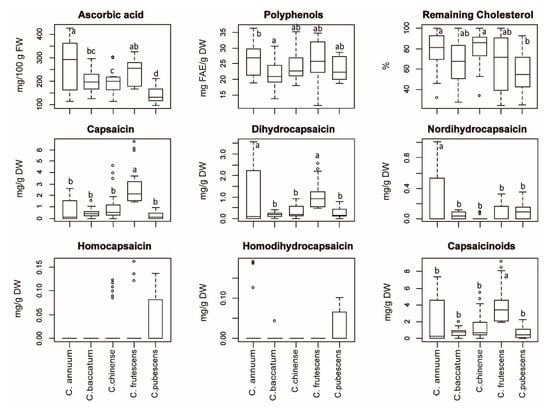 The analysis of variance, considering the species effect, indicated significant differences among Capsicum spp. for all biochemical measures, except for HCap and HDHCap. As above, ascorbic acid and capsaicinoids (primarily Cap) highly contributed to the differences among groups (Table 1). C. annuum showed the average highest level of ascorbic acid (279.8 mg/g FW), although this was not significantly different from that in C. frutescens (245.8 mg/g FW). The lowest amounts of ascorbic acid appeared in C. pubescens accessions (average of 142.4 mg/g FW) (Figure 1). The variation attributed to capsaicinoids was essentially due to the largest presence of capsaicin in C. frutescens in relation to other species (Figure 1). The distribution profiles, expressed as a percentage, confirmed that Cap and DHCap were the dominating capsaicinoids (Figure S2). C. frutescens, C. chinense, and C. baccatum primarily contained Cap; C. pubescens possessed mostly DHCap, while C. annuum exhibited an almost equal distribution for both capsaicinoids. Interestingly, accessions belonging to C. pubescens evidenced percentages of NDHCap, HCap, and HDHCap much higher than the other four Capsicum spp. (Figure S2). Only C. annuum and C. baccatum, which possessed the highest and lowest levels, respectively, displayed strongly significant differences for their content in total polyphenols (Figure 1). The lowest capacity to prevent cholesterol oxidation was observed in C. pubescens accessions, which significantly differed from that of the other four species.