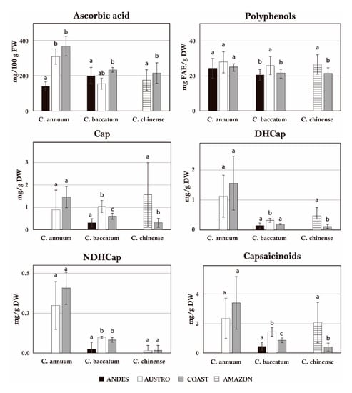 Differences among geographical regions were analyzed for C. annuum, C. chinense, and C. baccatum, which were represented by more than one accession at any of the four Ecuadorian areas (Coast, Andes, Austro, and Amazon). The analysis of phytochemical parameters per region pointed out that C. annuum fruits from the Coast and Austro contained significantly higher amounts of vitamin C and capsaicinoids than those originated from Andes (Figure 2). C. baccatum from Austro possessed the lowest amount of vitamin C but the largest significant values for phenols and capsaicinoids. Finally, C. chinense fruits coming from the Coast maintained higher amounts of vitamin C but significantly lower quantities of phenols and capsaicinoids than those growing in the Amazon region (Figure 2).