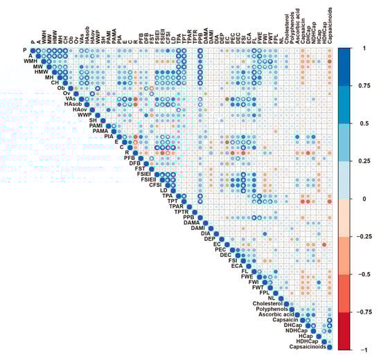 An analysis of correlation was performed with all fruit parameters to investigate the relationship between biochemical components and morphological traits, represented as conventional descriptors and morphometric attributes implemented in the TA software. Interestingly, the mean values of nutraceutical traits (except remaining cholesterol) showed a negative correlation with fruit conventional descriptors (Figure 3). Likewise, negative correlations were observed between biochemical parameters and the majority of TA measures, particularly with those under the categories of basic measurements and latitudinal section. Unexpectedly, none of these correlations were significant after Bonferroni correction for multiple testing. In the same manner, positive Pearson coefficients were recorded between pairs of biochemical parameters, although only Cap, DHCap, HDHCap, and NDHCap were significantly inter-correlated (Figure 3).