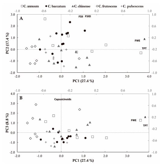 Scatter plot of the principal component analysis (PCA) analysis for forty-two Ecuadorian pepper landraces. (A) Principal Component 1 (PC1) vs. PC2; (B) PC1 vs. PC3. Secondary axes show the factor loadings values. Traits with the highest factors for each component are represented.