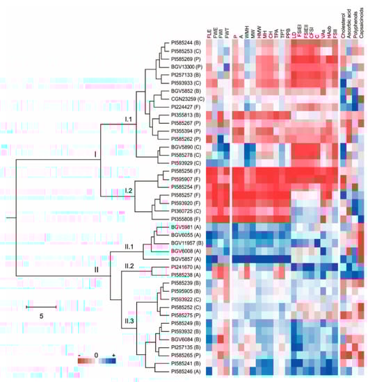 Hierarchical clustering was performed to identify groups of promising accessions with the most interesting traits. The parameters employed for that purpose were selected according to their contribution to the variance on the PCA outcome. Hence, only four conventional traits and eighteen TA attributes with correlation coefficients higher than 50% were considered for cluster analysis. Four biochemical compounds (ascorbic acid, polyphenols, remaining cholesterol, and capsaicinoids) were used to accomplish the assembly of pepper accessions. All variables were standardized to z-scores. The clustering pattern was independent of Capsicum spp. and primarily based upon fruit morphology and nutraceutical content (Figure 5). Two main groups (I and II) could be differentiated. The first one (I) comprised accessions mainly from C. chinense, C. frutescens, and C. pubescens with fruits of small and medium sizes and shapes from round to triangular. The subdivision of this group established two subgroups, one of which (I.2) clearly corresponded to C. frutescens accessions. The majority of pepper fruits within that subgroup were pungent (high level of capsaicinoids), of small size, and variable shape. The second cluster (II) contained mostly C. annuum and C. baccatum accessions with huge fruits of triangular and elongated shapes. The partitioning of this group distinguished a combination of C. annuum (II.1) holding the fruits with the largest size and lowest amount of capsaicinoids. Conversely, group II.3 consisted of C. baccatum accessions with high values for fruit shape indices, but low amounts of bioactive compounds (Figure 5). Interestingly, the two C. annuum accessions PI241670 and PI585238, which stand out for containing values above average for all the assessed nutraceutical compounds, constituted a highly distinctive group (II.2). Pepper fruits with the greater capabilities for inhibiting cholesterol oxidation and considerable amounts of vitamin C or phenols were broadly distributed across groups, except for II.3 (Figure 5).