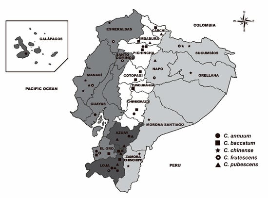 Forty-eight accessions from Ecuador depicting five domesticated species including C. annuum (7), C. chinense (11), C. frutescens (8), C. pubescens (10), and C. baccatum (12), were selected for this work (Table S6). They were kindly provided by the U.S. Department of Agriculture (USDA)—Agricultural Research Service (ARS)—Plant Genetic Resources Conservation Unit (Griffin, GA, USA), the Instituto de Conservación y Mejora de la Agrodiversidad Valenciana (COMAV, Valencia, Spain), and the Center for Genetic Resources (CGN, Wageningen, The Netherlands) (Table S6). When possible, they were selected to cover the four Ecuadorian geographical regions: Coast, Andes, Austro, and Amazon (Figure 6). For the sake of clarity, the accession PI585278 from the Galapagos Islands was considered within the Coastal region. This collection was previously characterized for genetic diversity and molecular markers linked to disease resistance and pungency-related traits [,]. The forty-eight landraces were cultivated during 2017 in an experimental field at the Technical University of Machala (Machala, El Oro, Ecuador) (03°16′ S, 79°54′ W). Ten plants per accession were grown following a completely randomized design. Cultivation was carried out according to the horticultural practices in the area for local pepper varieties. Thus, plants were drip irrigated and fertilized with a mix of nitrogen, phosphorus, and potassium before and after transplanting. Phytosanitary treatments against whiteflies, aphids, and spider mites were applied according to their population levels.