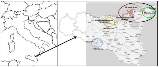 The “Regional Park of Nebrodi” is one of the largest protect area in Sicily (860 km2) which together with Madonie Mountains form the Sicilian portion of the Apennine mountain chain characterized by rural small-scale traditional communities, typical of the Mediterranean basin. Established on 1993, the “Regional Park of Nebrodi” is engaged in wild biodiversity and agrobiodiversity preservation highly interconnected with local peasant agriculture. The Sicilian Plant Germplasm Repository at the University of Palermo (SPGR/PA), together with the “Living Plant Germplasm Bank” (LPGB) of Ucria (ME) [] currently carry out their research activities devoted to the conservation and exploitation of common bean landraces. The LPGB houses ex situ germplasm collections are located inside the Nebrodi Mountains area for seed multiplication and storage. The SPGR/PA, Hortus Botanicus Panormitanus seed bank from 1993 [], collects, preserves, enhances, and redistributes endangered species, wild crop progenitors and cultivated species of Mediterranean areas and can be considered as a driving force for biodiversity conservation [].