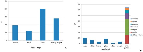 Percentage (%) of seed shape (A) and seed coat color and pattern (B) recorded on 57 Sicilian common bean landraces. In panel B the different types of seed coat pattern are reported.