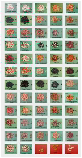 Fifteen-seven Sicilian common bean landraces conserved at SPGR/PA and “Living Plants Germplasm Bank” at Ucria sorted by seed morphotypes reported in Figure S2. Number in brackets = group morphotype. Three standard common bean genotypes are included (red background). Bar = 1 cm.
