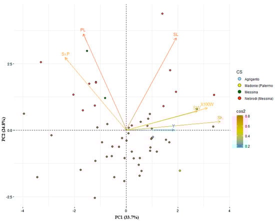Principal component analysis (PCA) for quantitative parameters detected on 57 Sicilian common bean accessions. Based on their collection macro site (CS), samples were organized in four groups and associated traits to landraces separation were indicated by colored vector in the plot, underlining their significance values (0.2 < cos2 < 0.8). SL = seed length; SH = seed height; SW = seed width; S × P= seed/pod; PL = pod length; 100W = 100-seed weight; Y = dry bean yield.