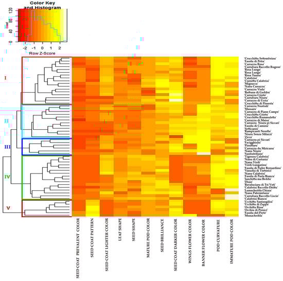 Heatmap of seed, pod and flower morphological traits of 57 Sicilian common bean accessions based on Euclidean distances. Red and yellow colors represent reduced and augmented representation levels, respectively. Hierarchical clustering of accessions (from cluster I to V) and traits are also shown.