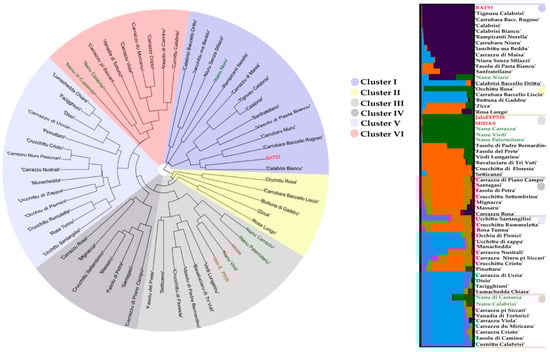 On the left phylogenetic analysis of Sicilian common bean germplasm collection, based on Bruvo’S distance coefficient and UPGMA cluster analysis. JaloEEP558, Midas (Andean) and BAT93 (Mesoamerican) were added as references. On the right Structure inferred for common bean germplasm collection analyzed. A horizontal line represents each sample. The length of colored segment highlights the membership percentage of samples to each group.