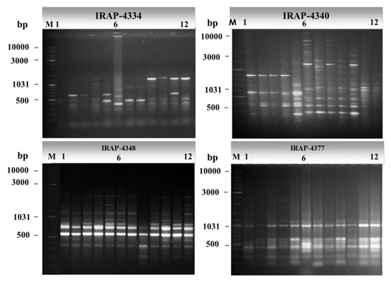 Agarose gel electrophoresis of PCR amplicons of some representative IRAP primers showing polymorphism of IRAP markers. DNA size marker Gene-Ruler 1 Kb plus DNA ladder (lane M) was used as molecular size standards in bps. Numbers from 1 to 12 refer to the sampling numbers of studied cultivars.