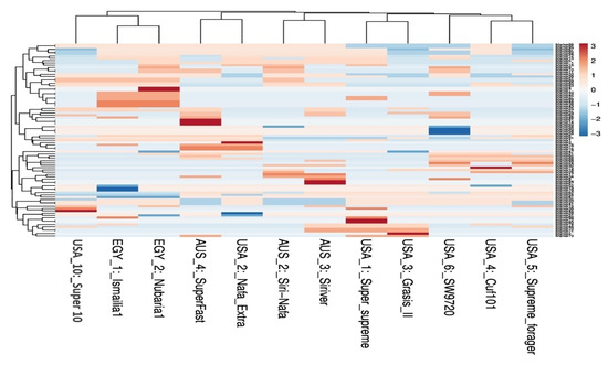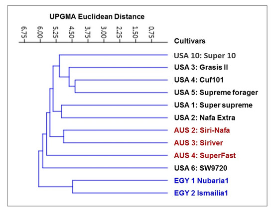Multivariate heatmap analysis was also used to construct a heatmap using the heatmap module of R software. The twelve cultivars clustered, as shown by the columns, into five clusters of two or three cultivars (Figure 4). The first cluster grouped the Egyptian cultivars together adjacent to USA10-Super10. The cultivars AUS4-SuperFast, USA2-Nafa Extra and the cultivars AUS2-Siri Nafa and AUS3-Siriver are differentiated as two neighboring pairs of cultivars. The other five American cultivars appeared as two neighboring clusters: one of USA1-Super-supreme and USA3-Grasis II and the other of USA4-Cuf101, USA5-Supreme forager and USA6-SW9720.