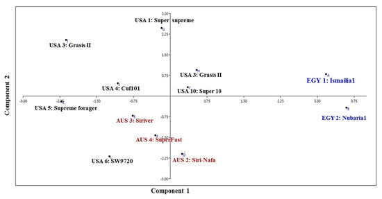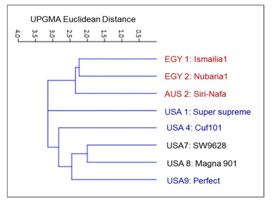 The PCA analysis reflecting the strength of the IRAP markers to classify the examined cultivars in a PCA scatter plot by plotting of PC1 and PC2, clearly discriminated the two Egyptian cultivars (Figure 3) and revealed the characteristic grouping of the EGY1-Ismailia1 and EGY2-Nubaria1 cultivars. In the same context, the Australian cultivars AUS2-Siri-Nafa, AUS3-Siriver and AUS4-SuperFast were grouped together, but USA10-Super10 was grouped with USA3-Grasis II. On the other hand, the rest of the American cultivars, USA1-Super-supreme, USA4-Cuf101, USA5-Supreme forager and USA6-SW9720, were scattered with some distance to each other.