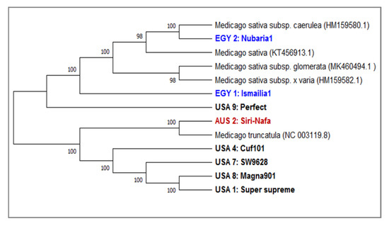 Morphological characters are the external expression of the genotype. The plant habit, stem, leaves, flower, fruit and seeds have been used for classification of alfalfa cultivars based on morphological variation [34,54]. Some of the examined cultivars were characterized by morphological traits [41]. The American cultivar USA8-Magna901, originating from DairyLand, America, has a high forage production, a fall dormancy rating of 9, and good growth in winter with a high resistance to nematodes [55]. USA4-Cuf101 is characterized with a high resistance to cold stress, Fusarium root rot, and root nodule nematodes. Hereby, USA4-Cuf101 is favored for its high forage production, a dormancy rating of 10, and dry climate resistance. Moreover, USA4-Cuf101 is characterized with a high tolerance to Fusarium and Pythophtora [55]. USA4-Cuf101 and USA8-Magna901 showed closer affinities to other American cultivars and a distant relationship to the Egyptian and Australian cultivars. Among the Australian cultivars, AUS2-Siri Nafa is characterized by drought tolerance and resistance to root diseases [55].