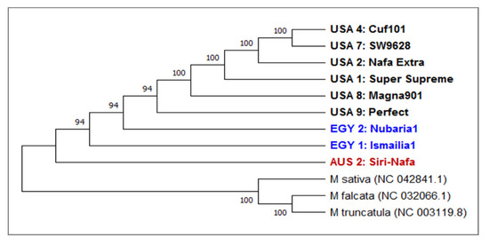 The present study revealed that matK is more variable than trnH in sequence variability among the tested Medicago cultivars. It has been reported that matK, due to its conservative mode of evolution, is widely used in many phylogenetic studies of flowering plants. It was used to distinguish medicinal plants and validate many herbal products [52,53]. In the current studies, eight alfalfa cultivars were differentiated based on matK sequence variation using five outgroup sequences (Figure 5). The phylogenetic tree generated using five NCBI-extracted matK sequences representing four M. sativa subspecies and one of M. truncatula supported the outstanding finding of separating the two Egyptian cultivars EGY1-Ismailia1 and EGY2-Nubaria1 along with M. sativa NCBI-extracted matK of M. sativa and its subspecies members as well as USA9-Perfect which was not included in the IRAP experiment. However, EGY2-Nubaria1 was separated with the M. sativa NCBI-extracted matK sequence of the subspecies caerulea, indicating sequence homology between them. In the second clade of four American cultivars, USA4-Cuf101, USA7-SW9623, USA8-Magna901 and USA1-Super supreme grouped with M. truncatula and AUS2-Siri Nafa, and the latter two cultivars shared the two most similar matK sequences.