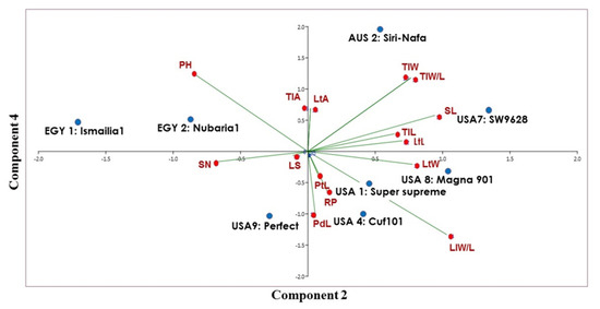 The clustering of the eight cultivars confirmed the close genetic relationship between the two Egyptian M. sativa cultivars. However, AUS2-Siri Nafa was assigned close to these two cultivars, whereas the two cultivars USA1-Super-supreme and USA4-Cuf101 were clearly isolated from a cluster of the other three cultivars, namely, USA7-SW9623, USA8-Magna901 and USA9-Perfect. A PCA biplot, constructed by blotting the PCA 2 and PCA 4, showed the best illustration of the impact of the studied morpho-agronomic traits on the discrimination of the examined cultivars (Figure 8). The affinity of the two Egyptian cultivars and their distinction from the other alfalfa cultivars was most influenced by plant height (PH) and stem number (SN). The distribution of the American cultivars in the biplot was most influenced by the following traits: lateral leaflet width/length (LlW/L), stipule length (SL), lateral leaflet length (mm) (LtL), lateral leaflet width (mm) (LtW), lateral leaflet length (mm) (LtL), and peduncle length (PdL). On the other hand, the distinction of AUS2-Siri Nafa was mostly impacted by the terminal leaflet width (TlW) and terminal leaflet width/length (TlW/L).