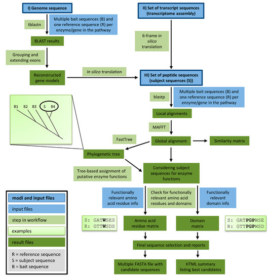 After identification of initial candidates through overall sequence similarity, a detailed comparison against a well characterised reference sequence with described functionally relevant amino acid residues is performed. All candidates are screened for matching amino acid residues at functionally relevant positions. Sequences encoding functional enzymes are expected to display a matching amino acid residue at all checked positions. Additionally, the conservation of relevant domains is analysed. A prediction about the functionality/non-functionality of all enzymes encoded by the candidate sequences is performed at this step. Results of intermediate steps are stored to allow in depth inspection if necessary.