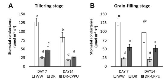 There was an obvious effect of drought stress on the stomatal closure, leading to reduced conductance at both tillering and grain-filling stages. Conversely, the well-watered plants maintained a healthy stomatal conductance. However, CPPU had a noticeable impact of on stomatal conductance under drought stress, whereby the stomatal conductance of CPPU treated plants was significantly higher than that of the untreated plants, with an exception on day 14 at tillering stage.