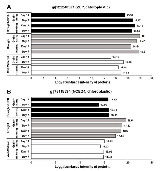 The influence of synthetic cytokinin and drought on the abundance intensities of ZEP (A) and NCED4 (B) proteins, implicated in ABA biosynthesis and stomatal conductance, at the tillering and grain-filling stages of the rice. Protein abundance intensities, represented on the X-axis, are the highest log2 fold change values of technical replicates. [Well-Watered plants were maintained at a soil moisture tension of −15 kPa during the treatment period. Drought stress was imposed by withholding water for up to 14 days. Soil moisture tensions of −55 kPa and −72 kPa were recorded at day 7 and day 14 during the treatment, respectively. CPPU treatment was given by foliar spraying plants with a 5 mg/L solution of CPPU at the rate of 25 mL/plant on day 6 of drought treatment.