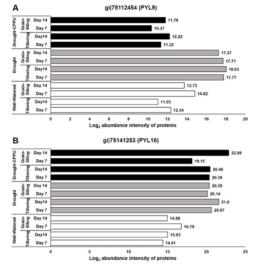 The influence of synthetic cytokinin and drought on the abundance intensities of PYL9 (A) and PYL10 (B) proteins, implicated in ABA reception and stomatal conductance, at the tillering and grain-filling stages of the rice. Protein abundance intensities, represented on the X- axis, are the highest log2 fold change values of technical replicates. [Well-Watered plants were maintained at a soil moisture tension of −15 kPa during the treatment period. Drought stress was imposed by withholding water for up to 14 days. Soil moisture tensions of −55 kPa and −72 kPa were recorded at day 7 and day 14 during the treatment, respectively. CPPU treatment was given by foliar spraying plants with a 5 mg/L solution of CPPU at the rate of 25 mL/plant on day 6 of drought treatment.