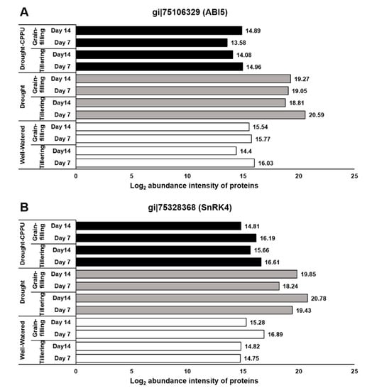 The influence of synthetic cytokinin and drought on the abundance intensities of ABI5 (A) and SnRK4 (B) proteins, implicated in ABA signaling and stomatal conductance, at the tillering and grain-filling stages of the rice. Protein abundance intensities, represented on the X- axis, are the highest log2 fold change values of technical replicates. [Well-Watered plants were maintained at a soil moisture tension of −15 kPa during the treatment period. Drought stress was imposed by withholding water for up to 14 days. Soil moisture tensions of −55 kPa and −72 kPa were recorded at day 7 and day 14 during the treatment, respectively. CPPU treatment was given by foliar spraying plants with a 5 mg/L solution of CPPU at the rate of 25 mL/plant on day 6 of drought treatment.