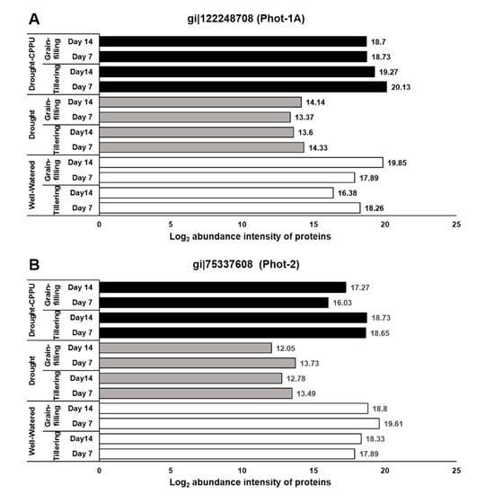 The influence of synthetic cytokinin and drought on the abundance intensities of phototropins, Phot-1 (A), and Phot-2 (B) proteins, implicated in photosynthesis and stomatal conductance at tillering and grain-filling stages of the rice. Protein abundance intensities, represented on the X- axis, are the highest log2 fold change values of technical replicates. [Well-Watered plants were maintained at a soil moisture tension of −15 kPa during the treatment period. Drought stress was imposed by withholding water for up to 14 days. Soil moisture tensions of −55 kPa and −72 kPa were recorded at day 7 and day 14 during the treatment, respectively. CPPU treatment was given by foliar spraying plants with a 5 mg/L solution of CPPU at the rate of 25 mL/plant on day 6 of drought treatment.