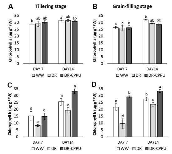 Photosynthetic pigments are essential for plants to harvest light energy and produce reducing powers. Pigments are prone to environmental stresses, particularly drought (Farooq et al., 2009). Osmotic stresses reduce chlorophyll b contents without substantially affecting the contents of Chl a in drought stressed leaves [,]. To apprehend the influence of CPPU on photosynthetic pigments under drought stress, we quantified Chl a and Chl b spectrophotometrically in drought stressed leaves of rice (Figure 6). Chl a contents were largely unaffected by either CPPU treatment or drought stress and the concentration fluctuated in a very narrow range of 26–32 µg g−1. Drought stress perpetually reduced the Chl b contents in the leaves at both growth stages of the rice. Chl b contents increased significantly in response to CPPU treatment under drought stress conditions. Interestingly, the Chl b content of CPPU treated plants under drought stress was higher than that in well-watered plants at day 14 in the tillering stage and at day 7 and day 14 in the grain-filling stage.