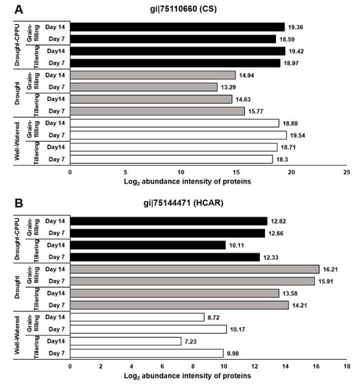The influence of synthetic cytokinin and drought on the abundance intensities of (A) chlorophyll synthase (CS) and (B) 7-hydroxymethyl chlorophyll a reductase (HCAR) proteins involved in biosynthesis/degradation of chlorophyll pigments at tillering and grain-filling stages of the rice. Protein abundance intensities, represented on the X- axis, are the highest log2 fold change values of technical replicates. [Well-Watered plants were maintained at a soil moisture tension of −15 kPa during the treatment period. Drought stress was imposed by withholding water for up to 14 days. Soil moisture tensions of −55 kPa and −72 kPa were recorded at day 7 and day 14 during the treatment, respectively. CPPU treatment was given by foliar spraying plants with a 5 mg/L solution of CPPU at the rate of 25 mL/plant on day 6 of drought treatment.
