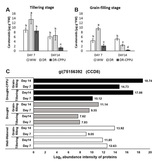 Total carotenoid contents (µg g−1 FW) quantified from rice leaves under different treatment conditions at tillering (A) and grain-filling (B) stages. WW = Well-watered plants (soil moisture tension of −15 kPa), DR = Drought stressed plants (Soil moisture tension of −55 kPa and −72 kPa at day 7 and day 14, respectively), and DR-CPPU = Drought stressed plants, sprayed with 5 mg/L CPPU on day 6 of drought treatment. Error bars represent SD (standard deviation). Letters viz. a, b, c, d, e, over SD bars indicate the highly significant differences of mean at p < 0.01 (**), as analyzed by Duncan’s Multiple Range Test (DMRT). (C) Influence of synthetic cytokinin and drought on the abundance intensities of the Carotenoid cleavage dioxygenases 8 (CCD8) protein involved in oxidative degradation of carotenoids at the tillering and grain-filling stages of the rice. Protein abundance intensities, represented on the X- axis, are the highest log2 fold change values of technical replicates. [Well-Watered plants were maintained at a soil moisture tension of −15 kPa during the treatment period. Drought stress was imposed by withholding water for up to 14 days. Soil moisture tensions of −55 kPa and −72 kPa were recorded at day 7 and day 14 during the treatment, respectively. CPPU treatment was given by foliar spraying plants with a 5 mg/L solution of CPPU at the rate of 25 mL/plant on day 6 of drought treatment.