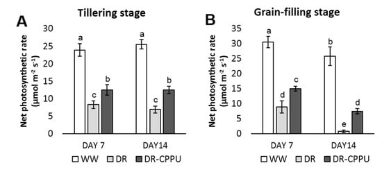 The rate of photosynthesis is invariably reduced under osmotic stress conditions primarily due to the closure of stomata, which hampers CO2 intake []. Furthermore, drought induced decline in chlorophyll pigments also accounts for the reduced rate of photosynthesis []. The role of externally applied synthetic cytokinins in improving the photosynthetic rate under environmental stress conditions has been reported in various crop species [,,,]. After investigating the effect of synthetic cytokinin treatment on the stomatal conductance and photosynthetic pigments during drought stress, it was pertinent to examine the cumulative effect of these factors on the rate of photosynthesis. Henceforth, we investigated the effect of synthetic cytokinin treatment on the net photosynthetic rate in drought stressed plants (Figure 9). The results indicated that the net photosynthetic rate was perpetually higher in well-watered plants irrespective of CPPU treatment. On the other hand, the net photosynthetic rate was drastically reduced by drought stress at both the tillering and the grain-filling stages. Nevertheless, CPPU treated plants maintained a significantly higher rate of photosynthesis compared with untreated plants under drought stress. At the tillering stage, the adverse effect of drought on photosynthesis was virtually identical on day 7 and day 14 of drought stress. On the other hand, there was a steep decrease in the rate of photosynthesis on day 14 of drought stress in the plants at the grain-filling stage.