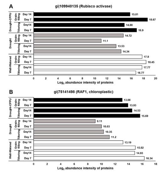 The influence of synthetic cytokinin and drought on the abundance intensities of (A) Ribulose bisphos carbo/oxygenase (Rubisco) activase and (B) Rubisco accumulation factor (Raf) 1 proteins involved in the regulation and functioning of Rubisco at the tillering and grain-filling stages of the rice. Protein abundance intensities, represented on the X- axis, are the highest log2 fold change values of technical replicates. [Well-Watered plants were maintained at a soil moisture tension of −15 kPa during the treatment period. Drought stress was imposed by withholding water for up to 14 days. Soil moisture tensions of −55 kPa and −72 kPa were recorded at day 7 and day 14 during the treatment, respectively. CPPU treatment was given by foliar spraying plants with a 5 mg/L solution of CPPU at the rate of 25 mL/plant on day 6 of drought treatment.