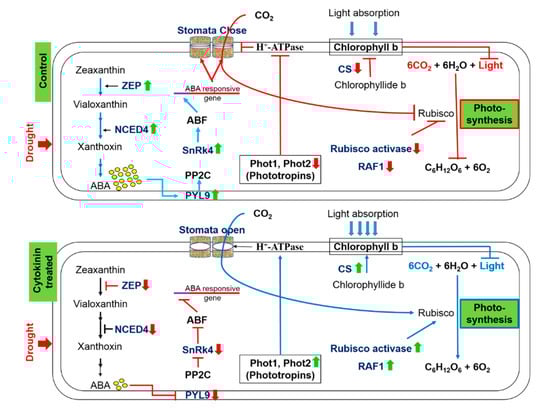 The positive impact of synthetic cytokinin on stomatal conductance, contents of chlorophyll b, and the process of photosynthesis under severe drought stress. Up (green) and down (red) arrows are the symbolic representations of increase and decrease, respectively. ZEP = Zeaxanthin epoxidase, NCED = 9-cis-epoxycarotenoid dioxygenase, ABA = Abscisic acid, PYL9 = Pyrabactin-like receptor 9, PP2C = Protein phosphatase type-2C, SnRK4 = Sucrose non-fermenting-1-related protein kinase 4, ABF = ABA responsive factor, Phot = Phototropin, CS = Chlorophyll synthase, RAF1 = Rubisco accumulation factor 1.