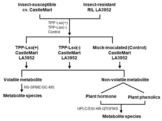 The tomato TPP-susceptible cultivar CastleMart (CM) and the TPP-resistant recombinant inbred line LA3952 from the cross of S. habrochaites with S. lycopersicum [], were grown at the Texas A&M AgriLife Research and Extension Center at Weslaco, TX, USA. Tomato plants were grown under controlled conditions with 16-h light/23 °C in 500-cc pots filled with peat moss Special Mix, BM Custom Blend (Berger Peat Moss Ltd., Saint-Modeste, QC, Canada). The full factorial experimental design consisted of two genotypes (CM vs. LA 3952) and three insect treatments [TPP-Lso(−), TPP-Lso(+), and a mock control]. The six factorial treatments were imposed at the 5th week after sowing. Ten adult psyllids were introduced onto the second fully opened leaf from the top, and confined on the leaf using organza bag cages to prevent them from escaping, while the mock-inoculated treatments consisted of empty cages only. Each treatment consisted of five replications. Local leaf tissues inside the bag cages were insects fed or mock-infected were collected 48 h after infestation, flash-frozen in liquid nitrogen, and stored at −80 °C until the time they were processed for analysis. The 48-h after infestation was chosen in accordance with previous studies on plant interactions with phloem feeders that have characterized resistance genotypes in tomato against potato aphid [,]. Furthermore, in the TPP-Lso complex, significant changes in transcript abundance has been detected 24 h post-inoculation []; therefore, changes in metabolic profile were expected to be observed 24–48 h period. Furthermore, previous studies using the electric penetration graph (EPG) indicate that at 24-h post-infection, 80% of the tested TPP had reached the inoculation access period (e.g., phloem salivation) []. The typical workflow is shown in Figure 1.