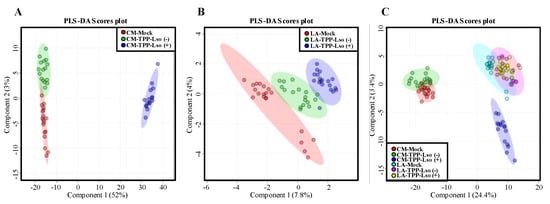 Two-dimensional partial least squares discriminate analysis (PLS-DA) of untargeted metabolomics. The dataset was obtained by ultra-performance liquid chromatography coupled to electrospray ionization high resolution quadrupole time-of flight mass spectrometry (UPLC/ESI-HR-QTOFMS). The PLS-DA score plots depict the differential metabolite clustering according to the treatments CM_TPP-Lso(−), CM_TPP-Lso(+) and CM_Mock as a control for insect-susceptible tomato genotype CastleMart,CM (A) and the treatments LA_TPP-Lso(−), LA_TPP-Lso(+), and LA_Mock as control for insect-resistant RIL LA3952, LA (B). A combined test for both genotypes and test groups is shown in (C).