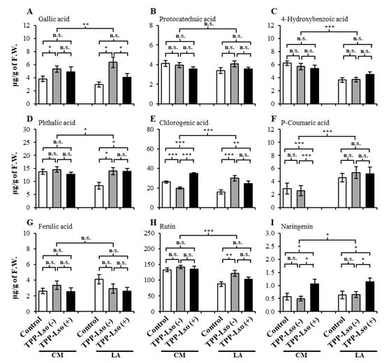 The levels of phenolics in the susceptible CastleMart (CM) and resistant RIL LA3952 (LA) tomato genotypes according to treatments, mock control, TPP-Lso(−), and TPP-Lso(+). (A) gallic acid, (B) protocatechuic acid, (C) 4-hydroxybenzoic acid, (D) phthalic acid, (E) chlorogenic acid, (F) p-coumaric acid, (G) ferulic acid, (H) rutin, and (I) naringenin. The results are presented as mean ± S.E., *, **, and *** denote significant difference at p ≤ 0.05, ≤ 0.01, and ≤ 0.001, respectively; ns, not significant. The means were separation by the Tukey’s honestly significant difference (HSD) test.