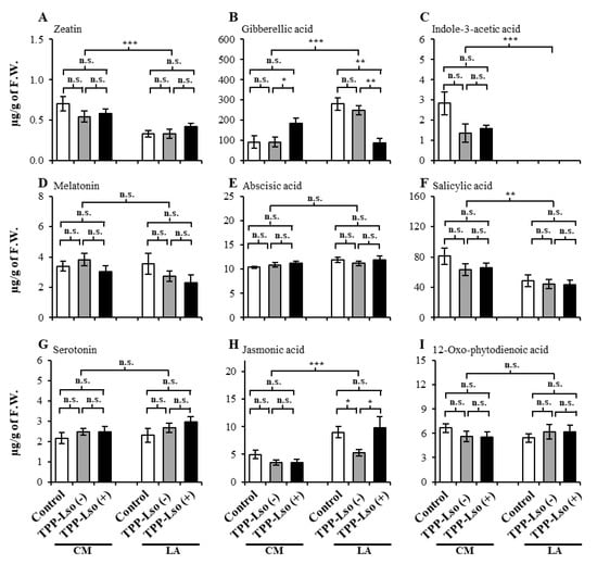 A total of six plant hormones zeatin, gibberellic acid, indole acetic acid, abscisic acid, salicylic acid, jasmonic acid, and other three plant signaling compounds, 12-oxophytodienoic acid (OPDA), melatonin, and serotonin from tomato plants were analyzed using UPLC/ESI-HR-QTOFMS (Table S2). Just as observed with the phenolics, the abundance of the hormone, abscisic acid (ABA, Figure 4E), and signaling molecules melatonin (Figure 4D), serotonin (Figure 4G), and 12-oxo-phytodienoic acid (Figure 4I) showed detectable but not statistically different abundance between genotypes or treatments, suggesting their constitutive levels are not influenced by the TPP in the presence or absence of Lso in the 48 h after inoculation.