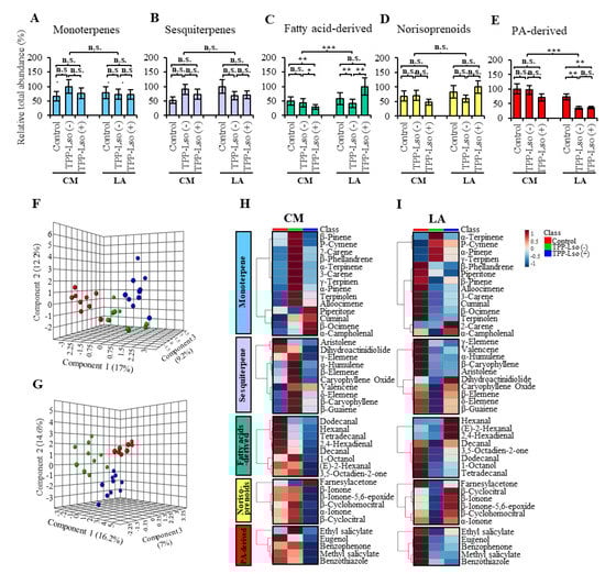 Volatile metabolite abundance in Control, TPP-Lso(−), and TPP-Lso(+) infested tomato plants, CastleMart (CM), and RIL LA3952 (LA), respectively. (A) monoterpenes (B) sesquiterpenes (C) fatty acid-derived (D) norisoterpenoid (E) phenylpropanoids (PA)-derived. Bar graphs indicate the mean total abundance of detected compounds in each chemical class. Three-dimensional (3D) sparse partial least square-discriminant analysis (sPLS-DA) scores plots of (F) insect-susceptible (CM) and (G) insect-resistant (LA) tomato plants demonstrate that each tomato variety can be separated into distinct groups without overlap according to the treatment [Blue dots, TPP-Lso(+); green, TPP-Lso(−), and red, mock-infested control]. The heatmaps show the effect of treatment on the mean abundance of studied metabolites within groups based on tomato varieties such as CM (H) and LA (I). The scale legend of the heatmap indicates the relative abundance of volatile metabolites in each chemical group. *, **, and *** denote significant at p ≤ 0.05, ≤ 0.01, and ≤ 0.001, respectively; n.s., not significant.