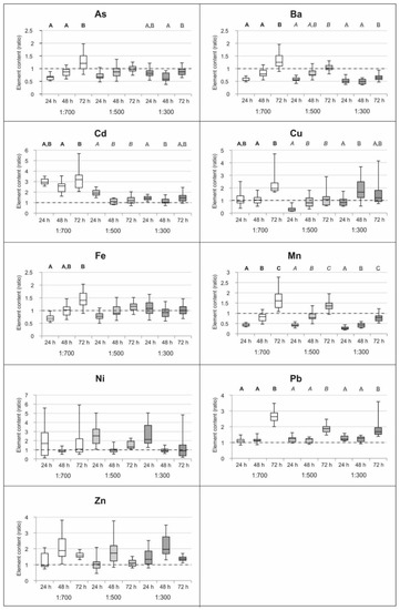 Expression of trace elements content in Azolla filiculoides (in terms of median, quartiles, min and max of ratios–normalized values to the control) treated with wood distillate solutions at 1:700, 1:500, 1:300 after three incubation periods (24 h, 48 h, 72 h) (N = 3). Statistically significant (p < 0.05) differences between the treatments along time are indicated by different capital letters (bold for 1:700, italic for 1:500, underlined for 1:300).