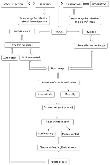 In recent years, there has been considerable interest and progress in the development of digital image analysis systems for the assessment of plant diseases [,]. Through digital image analysis, it is possible to streamline processes and analyze information [,]. Visual light imaging of diseased leaves can be obtained with relatively common equipment such as a scanner (destructive imaging) or a camera (non-destructive imaging). Imaging-based systems allow the collection of hundreds of digital images per unit time and their analysis with a high degree of automation. Early work by Kokko et al. [], Price et al. [] or Kampmann and Hansen [], with either black and white or color images, demonstrated that image analysis was superior to visual rating in different pathosystems including the coffee-leaf rust (Hemileia vastatrix) pathosystem. More recently, another image-based analysis system was able to identify and evaluate different classes of resistance to Septoria tritici blotch on wheat [,]. By contrast, some studies reported poor agreement between image analysis and rater estimates or actual values, including evaluation of the oat leaf rust (Puccinia coronata f. sp. avenae) on oats (Avena sativa) [], although, the most recent work highlighted the potential of image analysis for plant disease evaluation (reviewed in []). Accordingly, great progress has been made in recent years with regard to disease assessment through digital image analysis. However, several pitfalls remain. Most of the available software evaluate disease severity as percentage of diseased tissue, and only a few allow counting the number of pustules per unit area (i.e., Assess []), which, as indicated above, is the most accurate parameter to estimate rust infection. In addition, most of the available software are expensive, such as the most widely used Assess [] or Image-Pro Plus software [], which are not affordable for small or more modest research groups. On the other hand, users of open source image analysis software, such as ImageJ/Fiji [,], often need computer programming skills and time to write macros [] to adapt them to their needs.