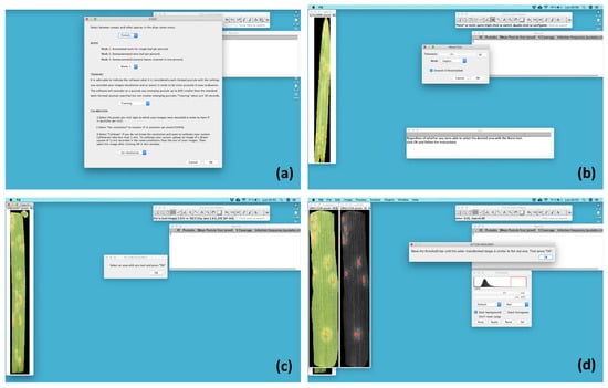 Screenshot of the Fiji application running RUST. (a). Screenshot for selecting crop, mode of evaluation, training/calibration option, and resolution. (b) and (c) Screenshot of the area selection step through the (b) automated wand tool or (c) manual selection. (d). Screenshot of the color transformation step that identifies rust pustules.