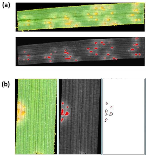 Digital imaging is increasing our analyzing capacity in many agronomic research fields, such as precision agriculture or phenotypic platforms. This enables evaluation of a wide range of parameters through visible and non-visible wavelengths that facilitate our understanding of many physiological processes [,]. In the field of disease resistance, digital imaging has sped up the breeding of resistance crops. For instance, analysis of more than 20,000 scanned leaves of wheat infected by Septoria tritici blotch showed that resistance mechanisms controlling host damage and pathogen reproduction were under separate genetic control, which open possibilities to combine these mechanisms in new, highly resistant cultivars to this devastating disease []. This highlights the high potential of this approach to breed for plant disease resistance.