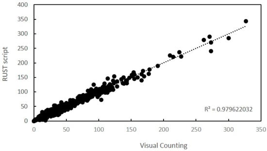 Between 6 and 12 leaves (from different plants and inoculation experiments) per genotype were studied. This made a total of 892 samples. Linear regression and correlation analysis were used to estimate the relationship and association, respectively, between the number of pustules counted by the rater (independent variable; x) and the digital count performed using the RUST script (dependent variable; y). Accuracy was calculated using Lin’s concordance correlation coefficient (LCCC). LCCC comprises several statistics that define the accuracy (Cb, generalized bias or bias correction factor) and precision (r, Pearson correlation coefficient) of the measurements and indicates the reproducibility of measurements collected by a new instrument/assay/device with respect to the standard method [,]. Reliability was calculated using the coefficient of determination (R2), which explains the proportion of the variance in the dependent variable that is predictable from the independent variable. Repeatability was estimated by calculating the variation coefficients obtained after repeated evaluation of the same image using RUST. To do this, 10 randomly selected images were evaluated independently five times each. All statistical analyses were performed with SPSS Windows v.26 software.