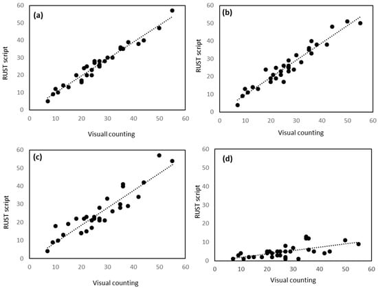 Linear relationship between the number of pustules estimated visually or with RUST under different scenarios. At 1200 ppi with (a) or without (b) the training step or at 300 ppi with (c) or without training step (d).