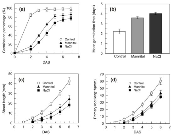 2.1. Growth Performances of Seedlings Grown under Control, Mannitol and NaCl Stress Conditions