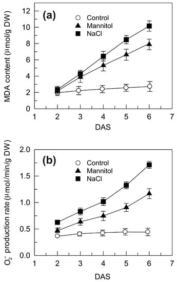 2.2. Malondialdehyde Accumulation and Superoxide Anion Generation Rate in the Shoots of Seedlings Grown under Control, Mannitol and NaCl Stress Conditions