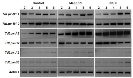 2.3. Expression Levels of the TdLpx Genes in the Shoots of Seedlings Grown under Control, Mannitol and NaCl Stress Conditions