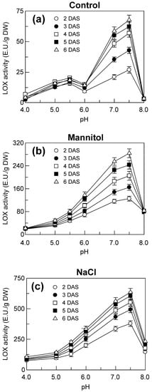 2.4. LOX Activity in the Shoots of Seedlings Grown under Control, Mannitol and NaCl Stress