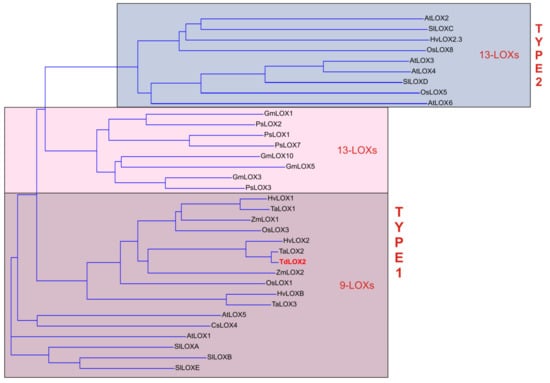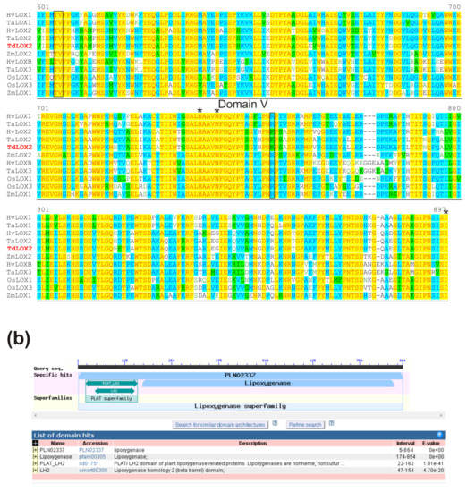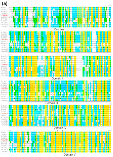 - Feng, B.; Dong, Z.; Xu, Z.; An, X.; Qin, H.; Wu, N.; Wang, D.; Wang, T. Molecular analysis of lipoxygenase (LOX) genes in common wheat and phylogenetic investigation of LOX proteins from model and crop plants. J. Cereal Sci. 2010, 52, 387–394. [Google Scholar] [CrossRef]