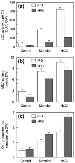 2.7. Effect of PG on the LOX Activity, the MDA Content and the Rate of Superoxide Anion Generation in the Shoots of Seedlings Grown under Control, Mannitol and NaCl Stress Conditions