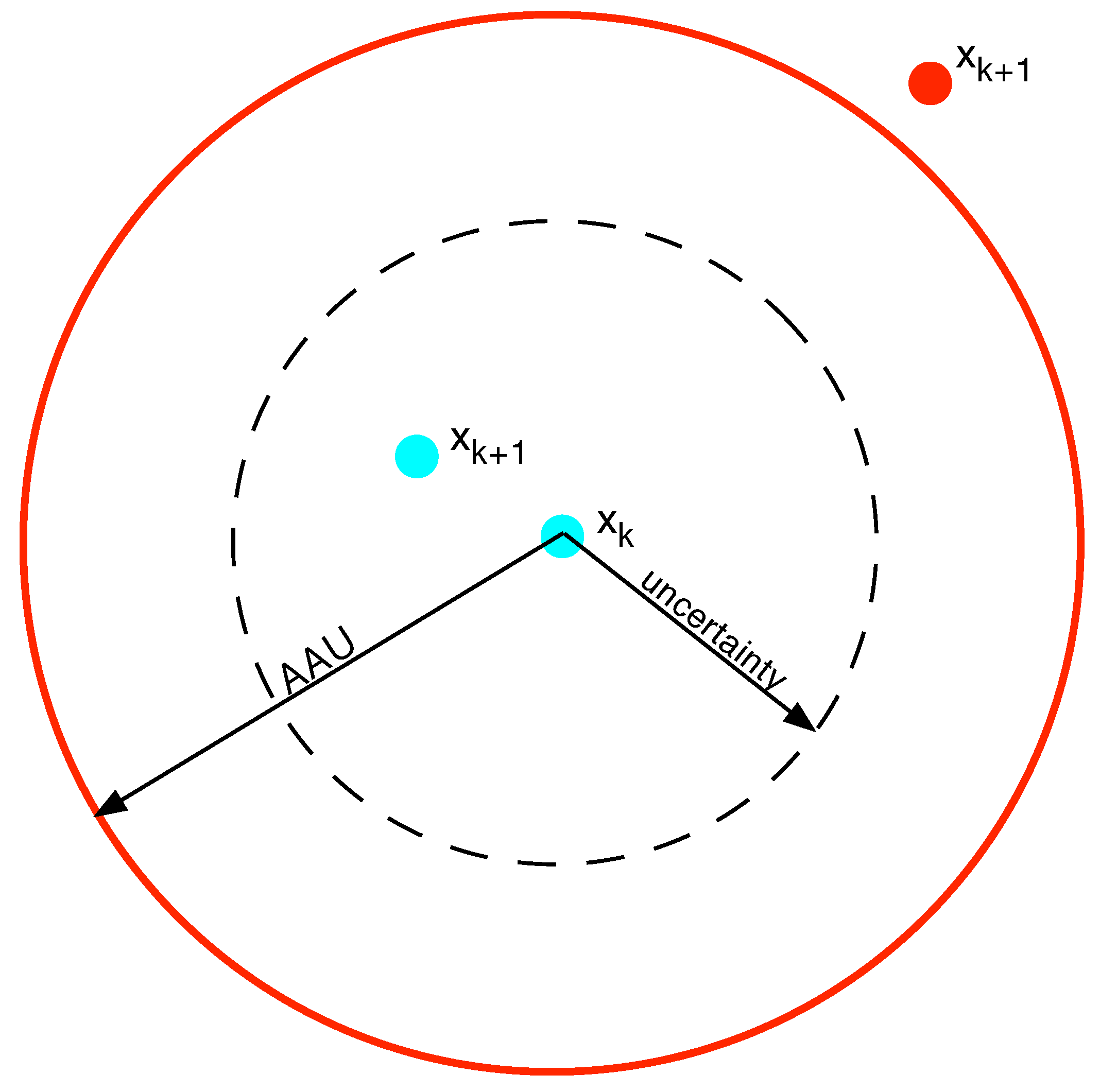 Figure 1 shows how GPS duty cycling works. At time k we obtain a GPS measurement xk and then turn off the GPS. At the next measurement xk+1, the mobile node may be either within or outside the AAU, indicated by the larger circle. Whenever xk+1 falls outside the larger circle, we denote this as an error, since the system would have failed to deliver a position estimate within the AAU.